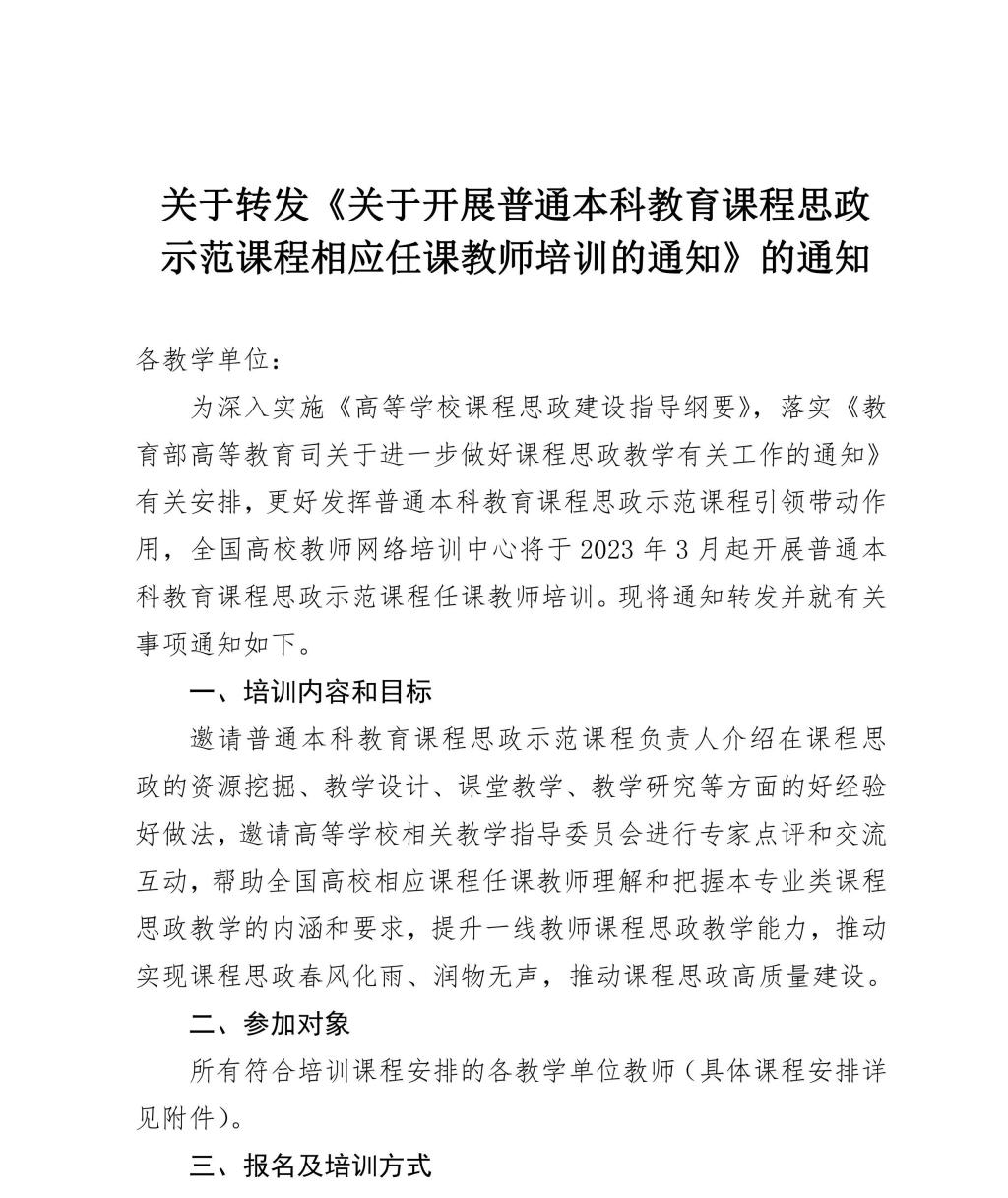关于转发《关于开展普通本科教育课程思政示范课程相应任课教师培训的通知》的通知